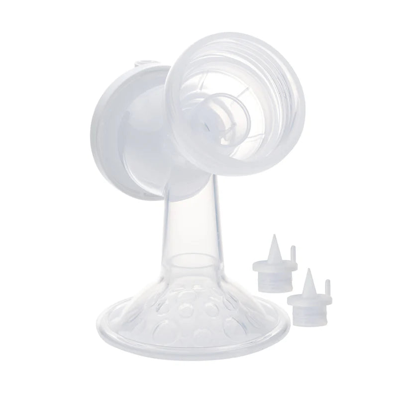 The flange commonly known as a breast shield, is a funnel-shaped plastic or silicone piece that fits directly over your nipple to form a seal around your areola. It creates a vacuum that gently draws your nipple into the funnel for milk removal, depending on the size of your nipple, you may need an insert for a better fit.